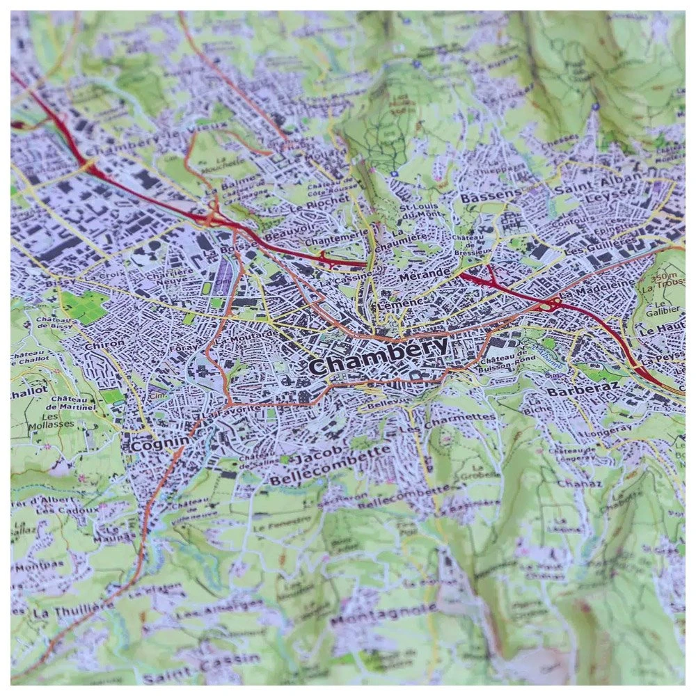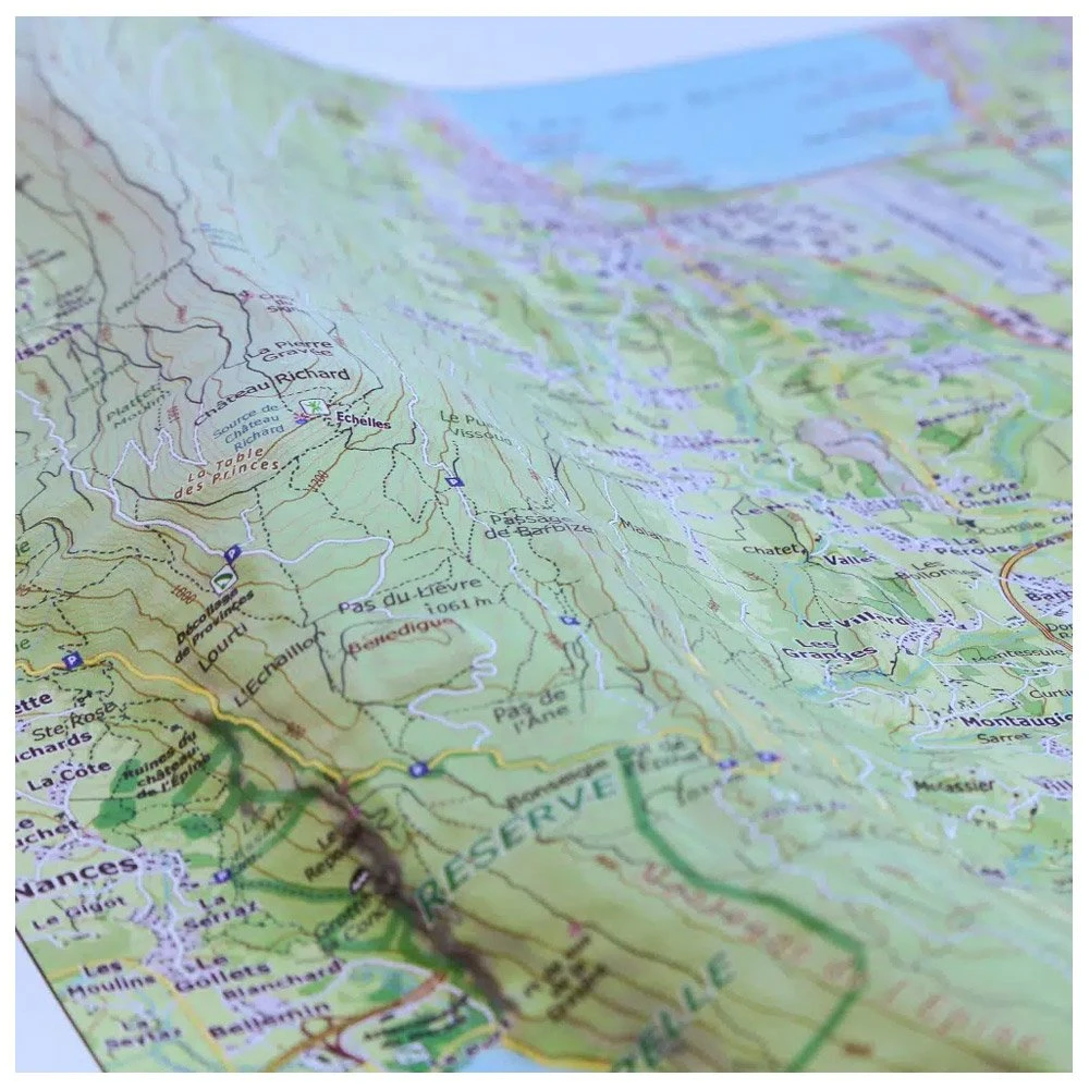 La carte en relief mise au point par la société d’édition auvergnate Dénivelés propose de s’immerger au sud du lac du Bourget, à Chambéry plus exactement et dans les alentours. Les amoureux de nature et les passionnés d’activités outdoor (trail running, parapente, varappe, escalade, alpinisme, vélo, VTT, randonnée, …) peuvent ainsi découvrir leurs futurs terrains de jeu : Mont du Chat, Mont du Nivolet, Mont de la Buffaz, etc. Idéale pour préparer vos prochaines escapades en montagne, cette carte topographique avec courbes de niveau permet d’appréhender les cols, les sommets, leur altitude, les crêtes, les combes et les vallées.