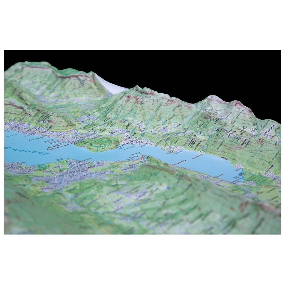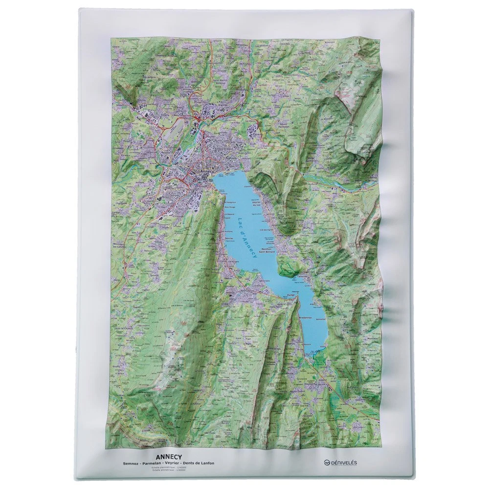La carte topographique 3D de la société d’édition auvergnate Dénivelés propose de s’immerger dans les reliefs qui entourent la ville et le lac d’Annecy. Les amoureux de nature et les passionnés d’activités outdoor (ski de rando, trail running, parapente, varappe, escalade, alpinisme, vélo, VTT, randonnée, …) peuvent ainsi découvrir leurs futurs spots : au nord-est, les monts Veyrier et Baret, puis, en allant vers le sud, les Dents de Lanfon, le col de la Forclaz. A l’ouest, le Semnoz et le Taillefer. Idéale pour préparer vos prochaines sorties, cette carte en relief avec courbes de niveau permet d’appréhender les cols, les sommets, leur altitude, les crêtes, les combes et les vallées.