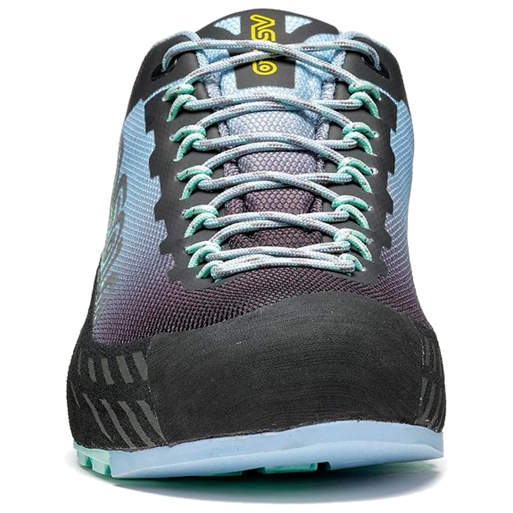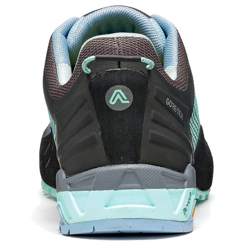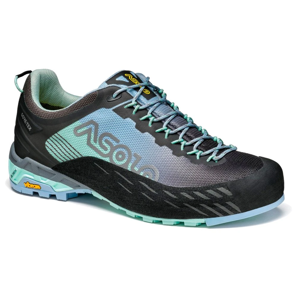 Abordez l’approche de votre session d’escalade dans les meilleures conditions avec la Eldo GV Women. Sa tige basse en polyester technique et sans couture lui permet d’être légère et garde votre cheville mobile. Sa membrane imperméable en GORE-TEX vous permet de garder vos pieds au sec tout en les laissant respirer, afin d’attaquer vos ascensions avec un maximum d’énergie. Sa semelle intérieure Asolo/Ortholite est confortable, tandis que sa semelle extérieure en caoutchouc Asolo/Vibram AG avec MegaGrip lui offre une bonne adhérence sur la roche. Au niveau de la pointe de la chaussure, une « climbing zone » plate et rigide est conçue pour escalader les parois plus difficiles et plus raides.