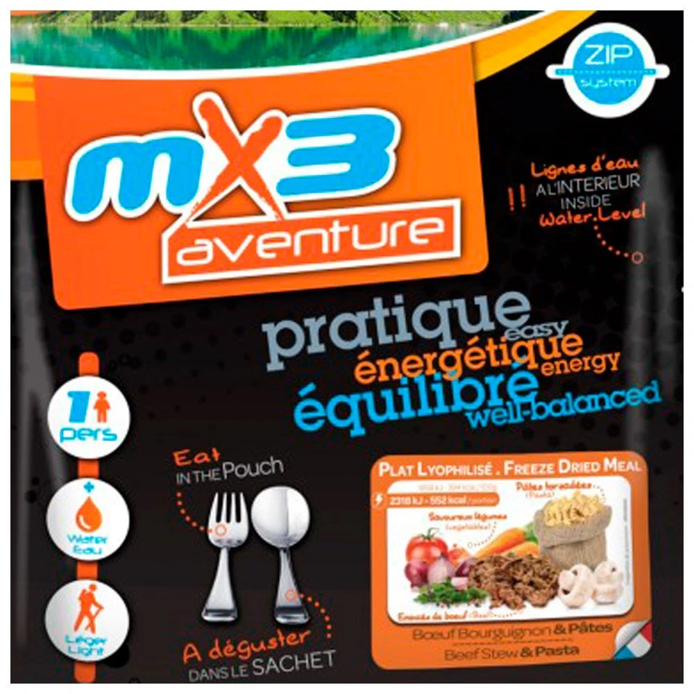 Le plat lyophilisé Bœuf Bourguignon & Pâtes correspond à la recette traditionnelle, savant mélange de bœuf fondant, de pâtes, de carottes et de champignons. La marque MX3 réussit à en faire un vrai régal. Une fois que l’eau que vous avez fait chauffer bout, il suffit de la verser dans le sachet, de mélanger et d’attendre 10 à 15 min avant de déguster. Ce repas, en plus d’être délicieux, est source d’énergie pour répondre à vos besoins nutritionnels quotidiens, quelle que soit l’activité outdoor pratiquée.